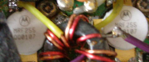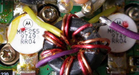 - MOSFETMRF255の交換は、相当の半田が盛られているので、ソルキューで大まかな半田を取り除き、その後半田吸取線で行った。半田ごては、60Wを使用し、FETを2個取り外しました。その後、取り付け完成。すべての作業終了、配線誤り、半田のかすの除去後、カバーを取り付け、電源オン。ダミーロードに取り付け試験電波発射、各バンドも100Wの出力を確認した。完全にMOSFETは不良であった。