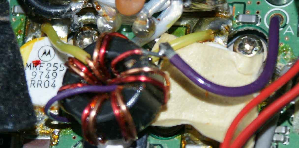 - 半田やせを修復、ダミーロードで出力計測した結果SWRが高値を示した。SWRが高いと出力損失が大きいのでパワーも出ない。UHF帯の基盤を目視で確認したが変色等の異常はなかった。次に、内部の同軸ケーブルを順次外し確認していくと異様に柔らかいケーブルがあった。断線か?、接点不良等を調整しパワーだし、購入者のコメントでは7Wであったが、定格の出力を認めた。
