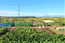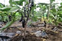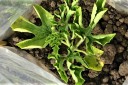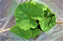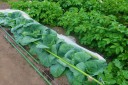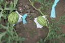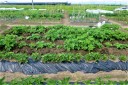連日の雨、風で野菜の葉がちぎれ、ビニル囲いも斜めになって風が強かったことを物語っています。5月の天候は17日間が雨等の天候不順でジャガイモが一律にそろって芽を出してくれませんでした。スイカも少しいじけているように思われます。