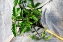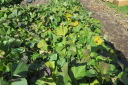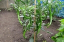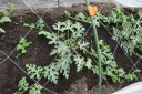 大根、白菜に虫が食われている苗もあるのでマリーゴールドの切り花を置きました。ズッキーニ、キュウリの枝など剪定。トラ豆のさやが枯れ始めたので9割方収穫しました。