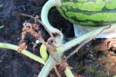 スイカは先月2日に受粉し40日経過で音、写真のひげをみて2個収穫しました。かぼちゃもコルク状態になっていたのですべて収穫し秋野菜の畑を作りました。  ジャガイモの茎はほとんどが枯れもうすぐ芋ほり、ホウレン草も芽が出て育っています。下段のスイカの収穫はもう少し 。
