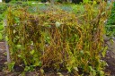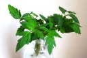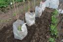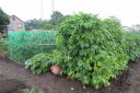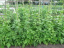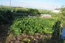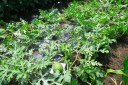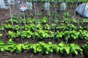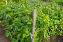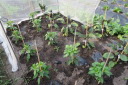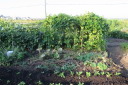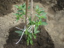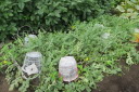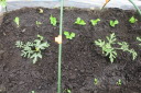 風も弱まり気温も上昇したことから、覆いビニルを取り外し風よけ網を付けました。ビニルを取った際カボチャを購入し植えたつもりが、おや、ズッキーニでした。早速かぼちゃを購入し植え付け。元のズッキーニは同じ菜園を借りている人に譲与。トマトの脇枝は水にさし根がでるか実験です。4日でジャガイモの畝が見えなくなるほどです。スイカの横には5月に種から育てたレタスの苗を植え、なすび・キュウリ、トマトの整枝を行いました。スイカは変わらず葉が丸まって土地になじんでない様子。