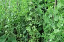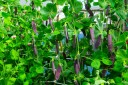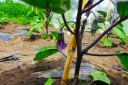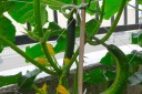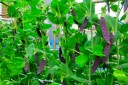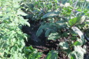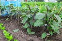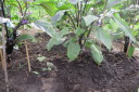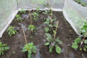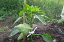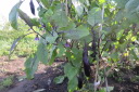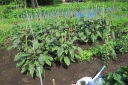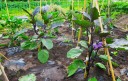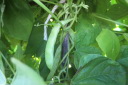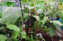 毎日気温の高い日続き野菜の生育が早まっています。ズッキーニは特に生育が早く数日後行くと肥大して種が入り、なすび、キュウリとも昨年を大きく上回る収穫です。スイカも6個ほど大きくなっていますが人工授粉していないため3日以降に受粉されたと考えられます。スイカの株間に植えたレタスは少し球が小さいですがスイカの生育に影響があると考え数個間引いて収穫。ツタンカーメンのエンドウ豆は紫の花が咲き紫のさやとなり収穫時期の目安として普通のエンドウ豆の色になってからとのこと。スイカ、カボチャ、茄子、ピーマン、しし唐の整枝を行いました。茄子には追肥実施。