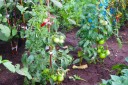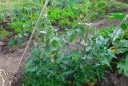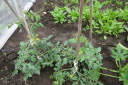 大雨の翌日です。気温も上がらないためそれほどの生育は見られなかった。大雨の前にニンニクを収穫し陰干しを行い、スナックエンドウの花も終わったことからすべて収穫しました。スイカの株間に植えたレタスはすべて収穫し、家裏に植えたキュウリは毎日数本採れています。トマトわき目を挿し木した苗は花が咲いています。
