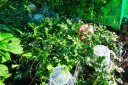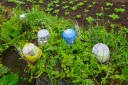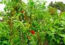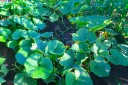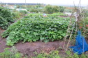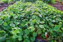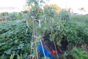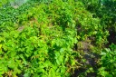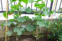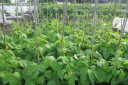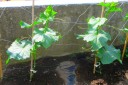 雨も降り気温も高めで生育が進んでキュウリは順調に整枝し写真全体に花が咲いています。去年の10月からのサツマイモのつる苗は下段中央ですが順調に育っています。スイカは4日前の約倍の大きさです。