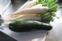 今日の成果は、大根の間引き収穫とズッキーニ1本、ホウレン草はすべて収穫。キュウリにネットを取り付けました。ニンニクの収穫は、葉が1/2程度以上に枯れてからということからもう少しです。
