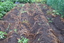 早朝、サツマイモ2株収穫の予定で菜園に行ったが、つるを取ると地割れが生じていた。掘ってみるといもが大きくなってできたものだった。天候が不順な状況下でここ1週間連続の雨が予想されることから急遽すべて収穫した。植えてから137日目でした。黒豆も葉が黄色ため刈り取り、天日干しに午後すべて収穫しました。全体的に猛暑だった夏のせいか例年より数量も多く、大きさも太かった、サツマイモの脇を掘った写真がありますが、茎が大きいものはサツマイモも大きく数多くついていました。紅あずまが一番大きく数量も多く次にシルクスイーツですが小柄ながら数量もそこそこ、鳴門金時が小ぶりで数量が他より少なかった。サツマイモのつるは乾燥すると切ずらいので青いうちにスコップで裁断した。