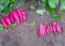 先週に続き高温に日々が続いており、菜園の生育が例年より早い気がする。ジャガイモの茎は枯れ、なすび等は多収穫。スイカ、トウキビ、ジャガイモはもう収穫の日が近い。獣の被害は今のところなく、購入したトマトの苗からの子は大きな玉までに生育、サツマイモは、左が紅はるか、中央が鳴門金時、右がシルクスイーツですが、生育の度合いが微妙に異なっています。