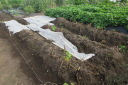毎日高温が続いていますが、菜園の土壌は湿潤です。移植した白菜は、虫に食われ悲惨な状態。大根は概ね良好サツマイモの畝がやっと埋まりました。害虫予防のため不織布で覆いをかけました。