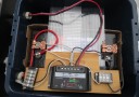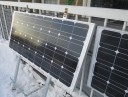 定格出力100Wを2枚を並列接続し、動作電圧18V,動作電量5.55A、季節による光量、降雪を考慮しパネルは、垂直から30度まで手動で可変、南向き。 |