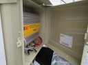 電圧12V 115Ah、接続にはショート防止、配線準備等を考慮し端子を使用、インバータは屋外設置のための引き込み線。コントロールチヤージーで電圧制御している。