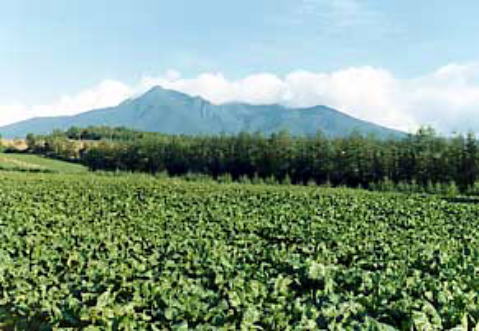 斜里岳(手前は北海道の代表する農作物)